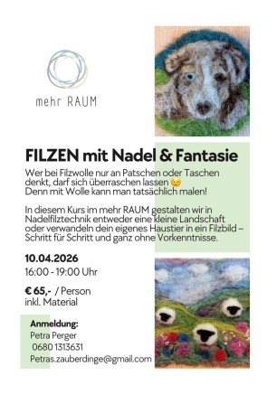 Du kannst entweder eine kleine Landschaft gestalten oder auch dein eigenes Haustier in Filz verewigen. Falls du dich für dein Haustier entscheidest, dann schicke mir bitte vorab ein Foto deines Haustiers per Mail.